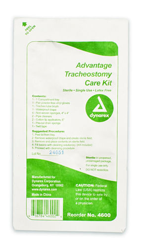 Includes: 1 Plastic tray with 1 compartments * 1 Twill tape 30 * 2 Cotton tipped applicators 6 * 1 Trachea tube brush * 1 Pre-cut gauze tracheostomy dressing * 4 Gauze sponges 4 4 * 1 Pair sterile powder free vinyl exam gloves * 2 Pipe cleaners *