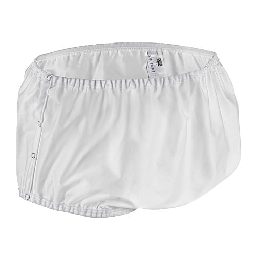 SNAP ON * X-Large 46 – 52 * One brief per package * For men or women * Designed to hold absorbent pads panties or diapers * Made of soft white plastic-coated nylon * Fully launderable and totally waterproof * Lightweight yet strong – will not tear
